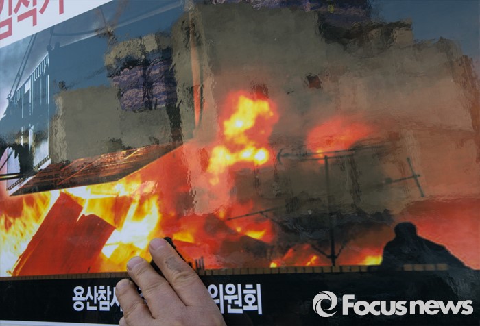 (서울=포커스뉴스) 13일 오전 서울 용산구 남일당 주차장에서 열린 '용산참사 7주기 추모주간 선포' 기자회견에 참석한 용산참사7주기 추모위원회원이 들고 있는 손팻말에 옛 남일당 터와 주변 건물이 비치고 있다.