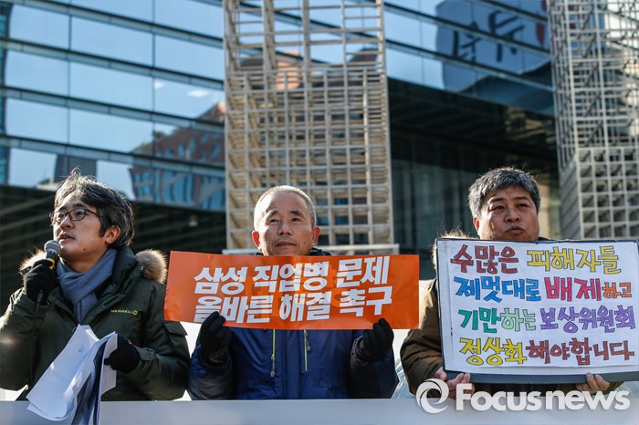 (서울=포커스뉴스) 13일 오전 서울 서초구 삼성전자 본관 앞에서, 반도체 노동자의 건강과 인권지킴이(반올림) 회원과 피해자 가족들이 전날 열린 조정위원회 합의 내용에 대한 입장을 밝히며 사과 및 보상 문제에 대한 조속한 해결을 촉구하고 있다.