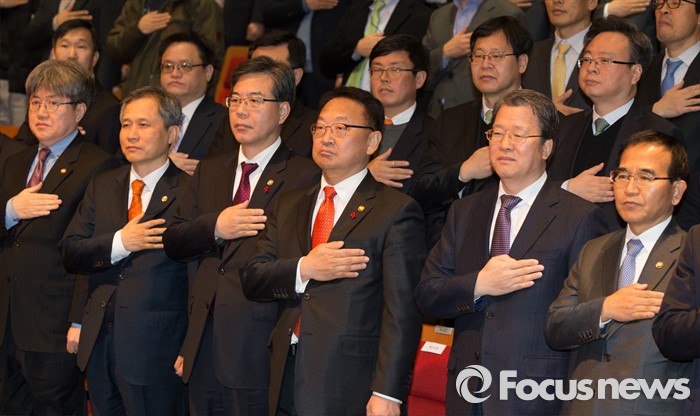 (세종=포커스뉴스) 유일호 신임 경제부총리 겸 기획재정부장관이 13일 오후 세종시 정부세종청사 대강당에서 열린 취임식에 참석해 국기에 대한 경례를 하고 있다.