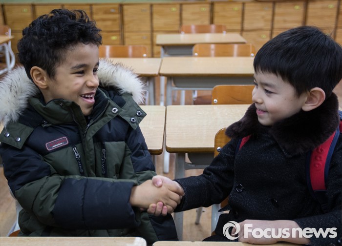 (서울=포커스뉴스) 초등학교 신입생 예비소집일인 13일 오후 서울 용산구 이태원초등학교에서 예비 초등학생 리차드 위키(왼쪽)가 교실에서 만난 친구와 악수를 나누고 있다.