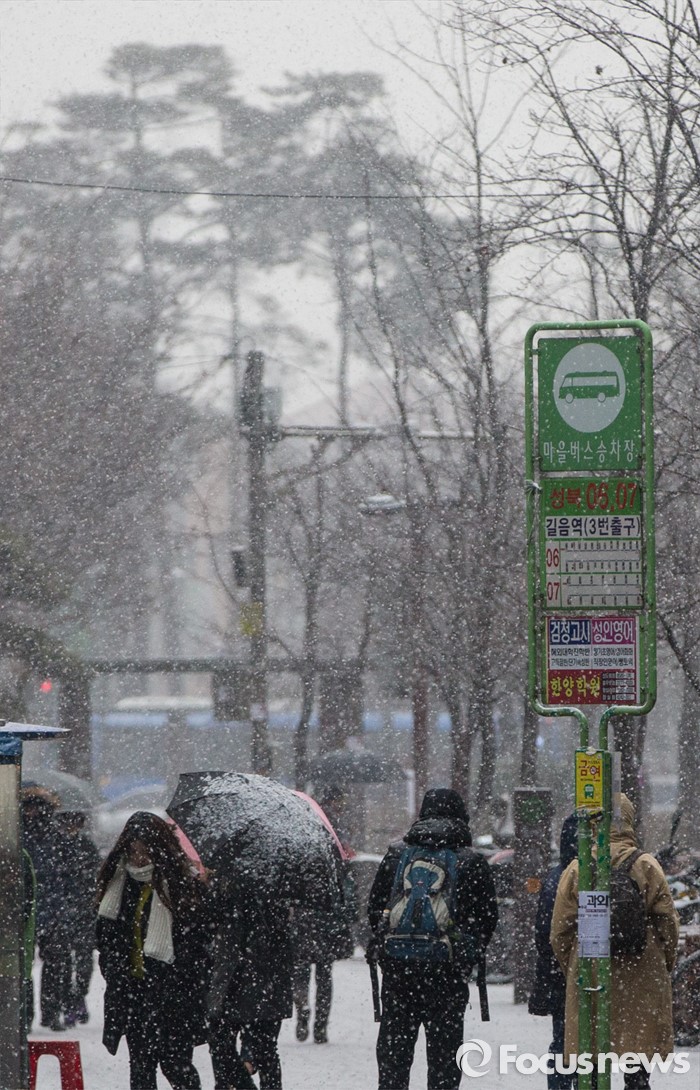 (서울=포커스뉴스) 서울을 포함한 중부지방에 많은 눈이 내린 13일 오후 서울 성북구 길음역 근처에서 시민들이 발걸음을 재촉하고 있다.