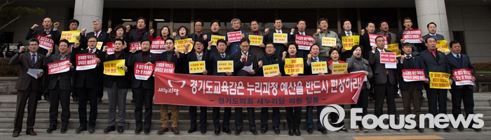 (수원=포커스뉴스) 누리과정 예산을 포함한 올해 예산안 심의를 위한 임시회 본회의 예정일인 13일 오후 경기도의회 앞에서 새누리당 의원들이 '경기도교육감은 누리과정 예산을 반드시 편성하라'는 기자회견을 하고 있다.