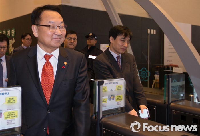 (세종=포커스뉴스) 유일호 신임 경제부총리 겸 기획재정부장관이 취임식을 앞두고 13일 오후 세종시 정부세종청사 기획재정부를 첫 출근하고 있다.