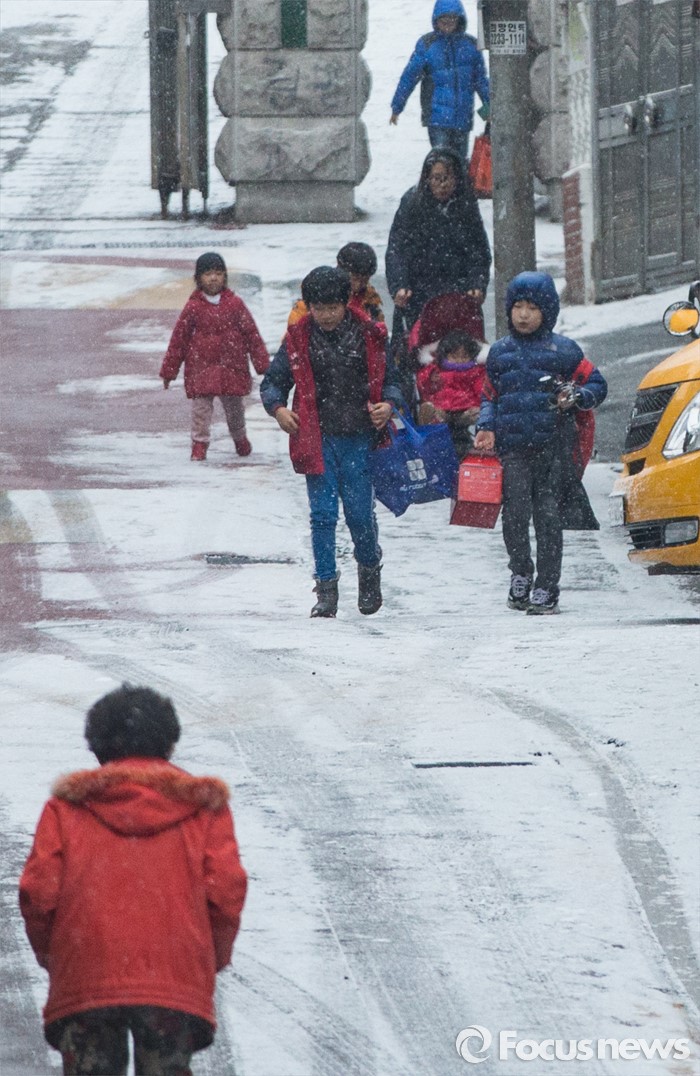 (서울=포커스뉴스) 서울을 포함한 중부지방에 많은 눈이 내린 13일 오후 서울 강북구의 한 초등학교 앞에서 어린이들이 발걸음을 재촉하고 있다.