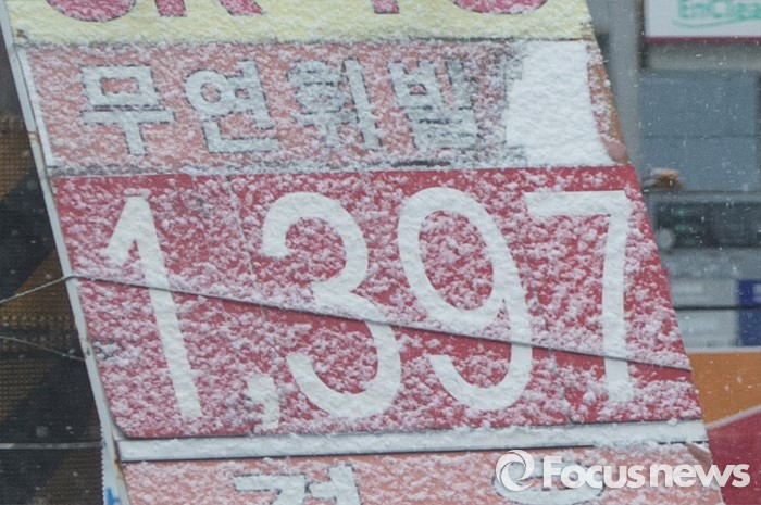 (서울=포커스뉴스) 국제유가가 배럴당 장중 30달러선이 붕괴된 13일 오후 서울 강북구의 한 주유소 유가정보판 위로 눈이 쌓여 있다.