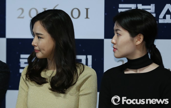 (서울=포커스뉴스) 13일 오후 서울 광진구 롯데시네마 건대입구점에서 열린 영화 '로봇, 소리' 언론시사회에 참석한 배우 이하늬(왼쪽)와 심은경이 취재진에게 질문을 받고 있다.
