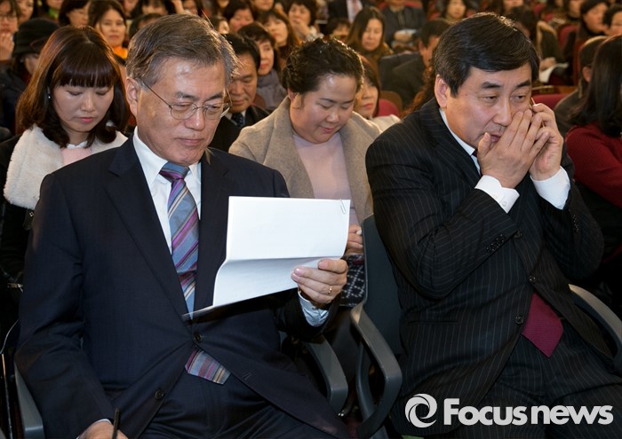 (서울=포커스뉴스) 13일 오후 서울 여의도 국회 의원회관에서 더불어민주당 누리과정특위 주최로 열린 임박한 보육대란, 어떻게 해결할 것인가 긴급 현안토론회에 참석한 이종걸 원내대표가 누군가와 통화를 하고 있다. 왼쪽은 문재인 대표.