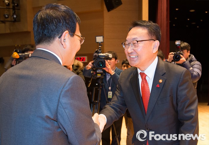 (세종=포커스뉴스) 유일호 신임 경제부총리 겸 기획재정부장관이 13일 오후 세종시 정부세종청사 대강당에서 열린 취임식에 참석해 직원들과 악수를 하고 있다.