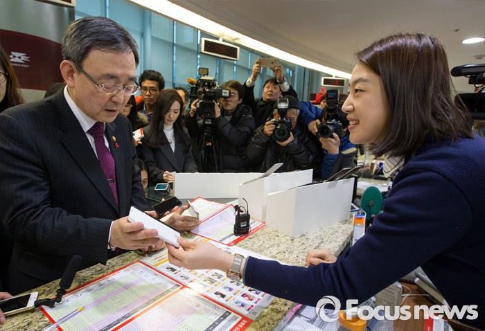 (서울=포커스뉴스) 13일 오후 서울 중구 중앙우체국 알뜰폰 판매창구를 찾은 최성준 방송통신위원장이 직원과 대화하고 있다.