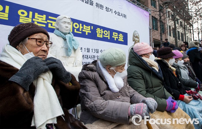 (서울=포커스뉴스) 13일 오후 서울 종로구 옛 일본대사관 앞에서 열린 제1213차 정기수요집회 앞서 열린 한일 일본군 위안부 합의 무효 기자회견에서 일본군 위안부 피해자 할머니들이 목도리와 마스크를 하고 있다.