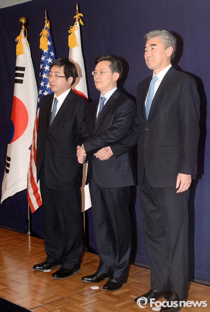 (서울=포커스뉴스) 한미일 6자회담 수석대표가 4차 핵실험을 감행한 북한에 대한 강력하고 실효적인 제재 방안 논의를 위해 13일 오후 서울 소공동 롯데호텔에서 만나 악수하고 있다. 왼쪽부터 이시카네 기미히로(石兼公博) 일본 아시아대양주국장, 황준국 외교부 한반도평화교섭본부장, 성 김 미 국무부 대북정책특별대표.