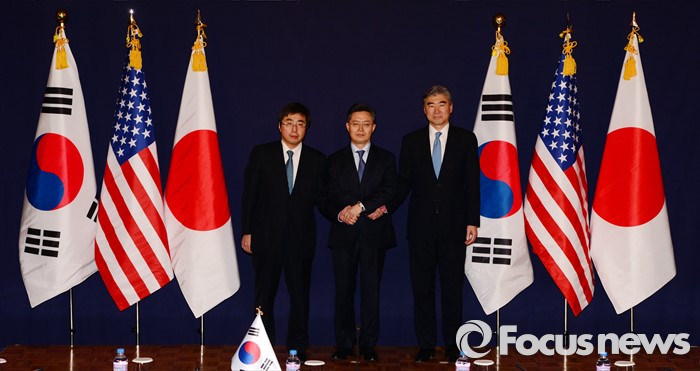 (서울=포커스뉴스) 한미일 6자회담 수석대표가 4차 핵실험을 감행한 북한에 대한 강력하고 실효적인 제재 방안 논의를 위해 13일 오후 서울 소공동 롯데호텔에서 만나 악수하고 있다. 왼쪽부터 이시카네 기미히로(石兼公博) 일본 아시아대양주국장, 황준국 외교부 한반도평화교섭본부장, 성 김 미 국무부 대북정책특별대표.
