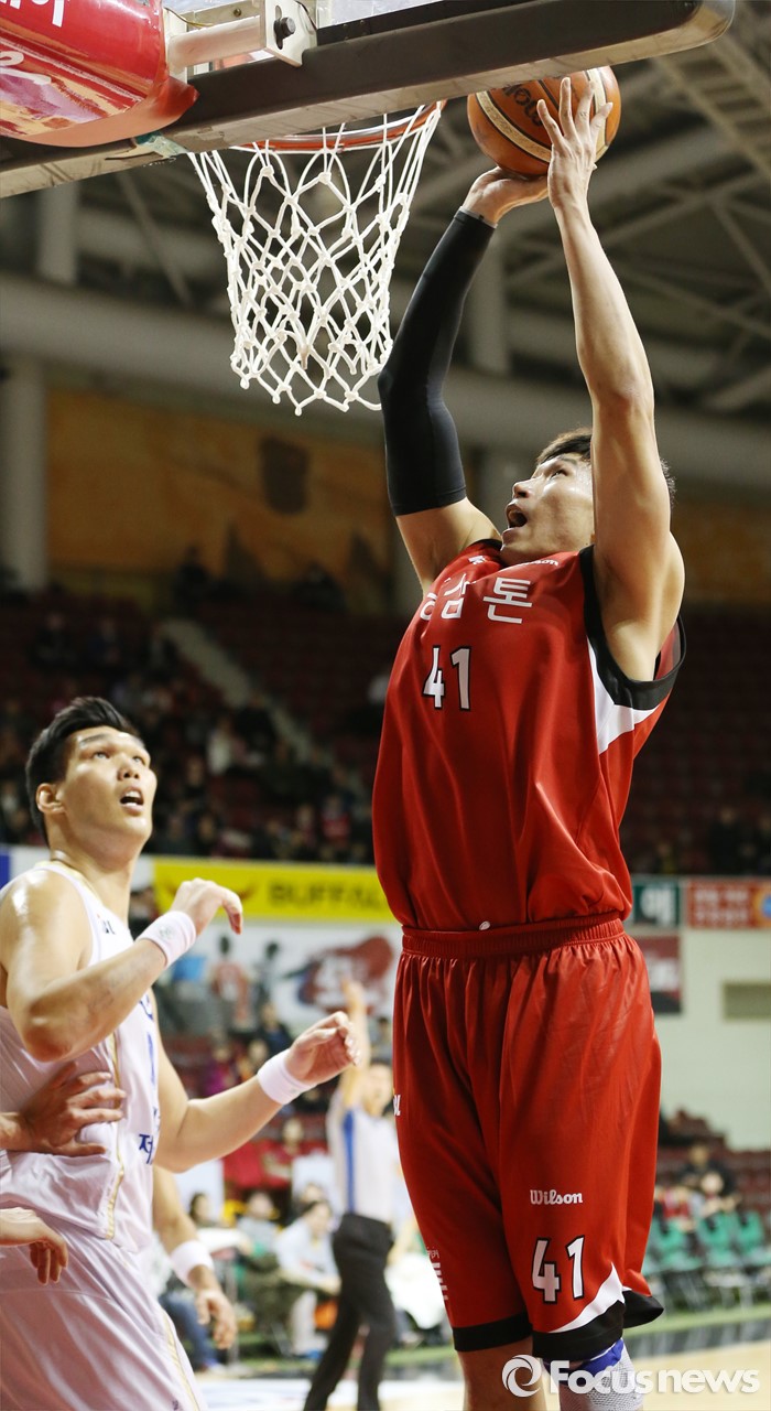 (안양=포커스뉴스) 13일 안양실내체육관에서 열린 2015-2016 프로농구 KGC-KCC 경기에서 KGC 오세근이 KCC 하승진을 앞에 두고 골밑에서 점프슛을 하고 있다.