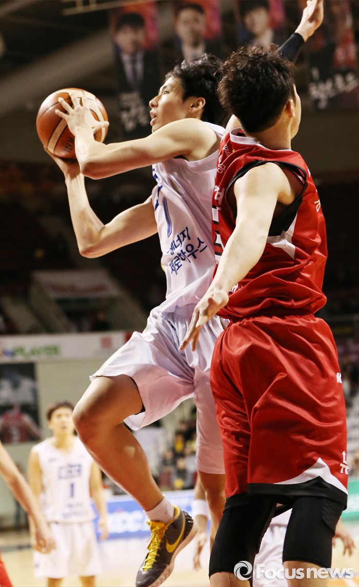 (안양=포커스뉴스) 13일 안양실내체육관에서 열린 2015-2016 프로농구 KGC-KCC 경기에서 KCC 송교창이 KCC 이정현의 수비를 제치고 레이업슛을 시도하고 있다.