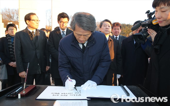 (서울=포커스뉴스) 14일 오전 서울 강북구 국립 4.19 민주묘지를 찾은 한상진 국민의당 창당준비위원장이 참배 후 방명록을 작성하고 있다.