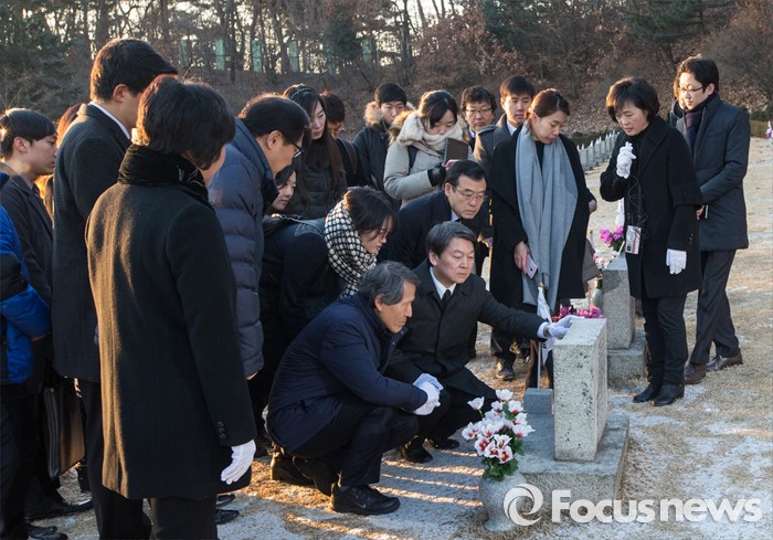 (서울=포커스뉴스) 14일 오전 서울 강북구 국립 4.19 민주묘지를 찾은 한상진 국민의당 창당준비위원장과 안철수 인재영입위원장이 혁명의 도화선이 됐던 고 김주열 열사의 묘비를 어루만지고 있다.