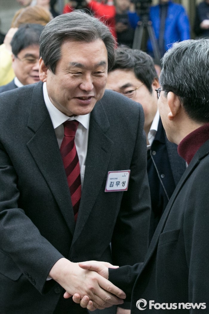 (서울=포커스뉴스) 김무성(왼쪽) 새누리당 대표와 이한구 전국위원회 의장이 14일 오전 서울 여의도 국회에서 열린 제7차 상임전국위원회에 참석해 악수하고 있다.