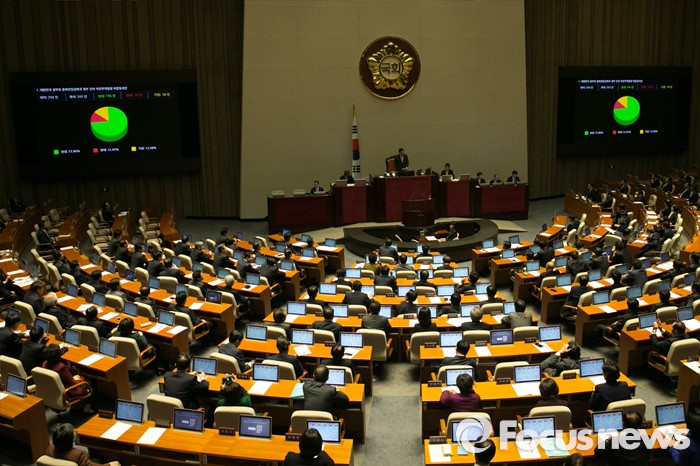 국회선진화법은 지난 18대 총선에서 당시 비대위원장이었던 박근혜 대통령이 공약했고, 당시 새누리당 대표였던 황우여 의원이 대표발의하는 등 새누리당이 당론을 모아 제정한 법이다.(서울=포커스뉴스) 30일 오후 서울 여의도 국회의사당 본회의장에서 한·중FTA 비준동의안이 통과되고 있다. 2015.11.30 박철중 기자