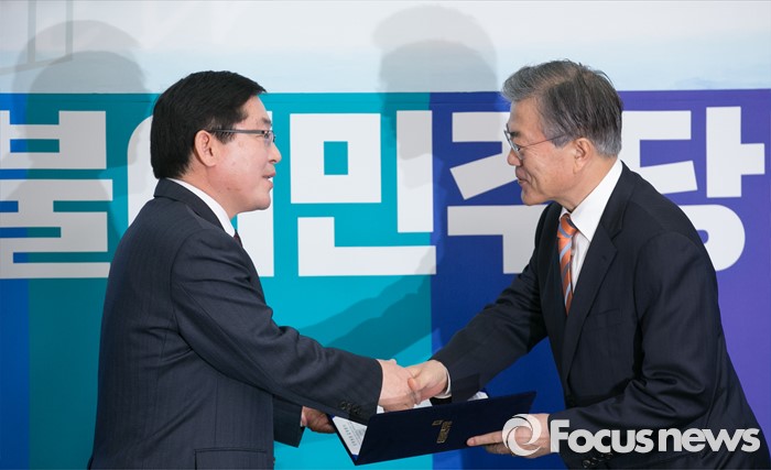 (서울=포커스뉴스) 문재인(오른쪽) 더불어민주당 대표가 14일 오전 서울 여의도 국회에서 열린 인재영입 기자회견에 참석해 박희승 전 수원지법 안양지원장으로부터 입당원서를 전달받고 있다.