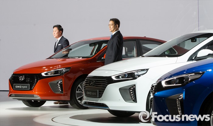 (서울=포커스뉴스) 14일 오전 서울 중구 동대문디자인플라자에서 권문식(오른쪽) 현대자동차 부회장과 곽진 부사장이 하이브리드 자동차 '아이오닉'을 선보이고 있다.