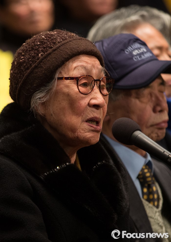 (서울=포커스뉴스) 14일 오후 서울 중구 프레스센터에서 시민사회단체와 학생, 예술 단체 등 사회각계각층이 참여하는 '한일 일본군 위안부 합의 무효와 정의로운 해결을 위한 전국행동' 발족 기자회견이 열리고 있는 가운데 김복동 할머니가 피해자 발언을 하고 있다.