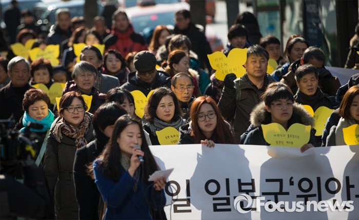 (서울=포커스뉴스) 14일 오후 '한일 일본군 위안부 합의 무효와 정의로운 해결을 위한 전국행동' 발족 기자회견을 마친 한국정신대문제대책협의회와 시민사회단체들이 '한국 정부에게 보내는 요구서'를 전달하기 위해 서울 중구 프레스센터에서 출발해 세종로를 따라 외교부 청사로 행진하고 있다.