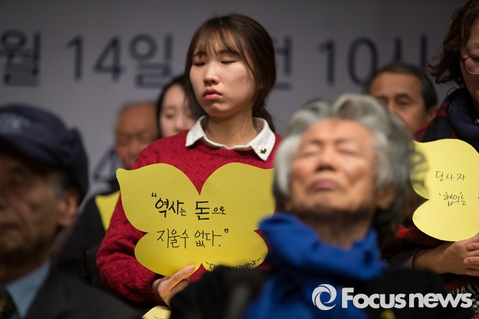 (서울=포커스뉴스) 한국정신대문제대책협의회와 시민사회단체가 14일 오후 서울 중구 프레스센터에서 시민사회단체와 학생, 예술 단체 등 사회각계각층이 참여하는 '한일 일본군 위안부 합의 무효와 정의로운 해결을 위한 전국행동' 발족 기자회견을 열고 있다.