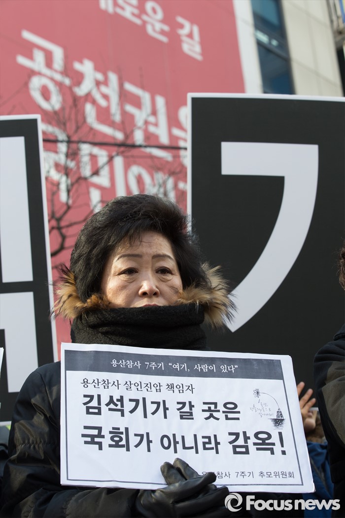 (서울=포커스뉴스) 용산참사 진상규명위원회 및 유가족들이 14일 오후 서울 영등포구 여의도 새누리당사앞에서 열린 새누리당 총선 예비후보(경주), 용산참사 책임자 김석기 규탄 기자회견을 열고 있다.