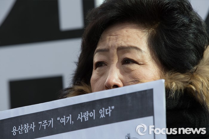 (서울=포커스뉴스) 용산참사 진상규명위원회 및 유가족들이 14일 오후 서울 영등포구 여의도 새누리당사앞에서 열린 새누리당 총선 예비후보(경주), 용산참사 책임자 김석기 규탄 기자회견을 열고 있다.