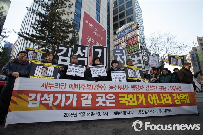 14일 오후 1시 서울 여의도 새누리당사 앞에서 유가족을 포함한 용산참사진상규명위원회 관계자들은 김석기 전 한국공항공사 사장의 새누리당 총선 예비후보(경주) 등록을 규탄하는 기자회견을 열고 이같이 밝혔다.