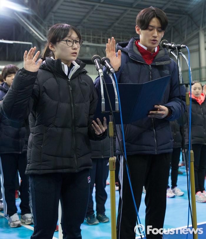 (서울=포커스뉴스) 14일 오후 서울 노원구 태릉선수촌 오륜관에서 열린 2016년 국가대표 훈련개시식 및 체육인 신년인사회에서 태권도 국가대표 이대훈(오른쪽)과 빙상 국가대표 최민정이 선수대표로 선서를 하고 있다.