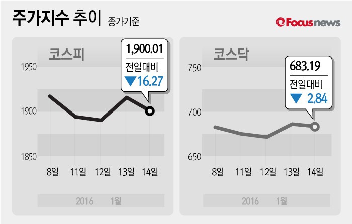 14일 코스피지수는 전일 대비 0.85%(16.27포인트) 내린 1900.01에 장을 마쳤다. 코스닥지수는 전날 보다 0.41%(2.84포인트) 하락한 683.19에 마감했다.