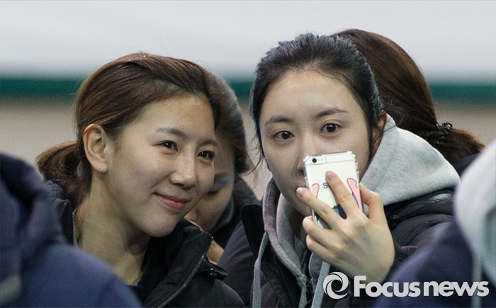 (서울=포커스뉴스) 14일 오후 서울 노원구 태릉선수촌 오륜관에서 열린 2016년 국가대표 훈련개시식 및 체육인 신년인사회에서 펜싱 국가대표 신아람(오른쪽)과 유진실이 휴대폰으로 기념촬영을 하고 있다.