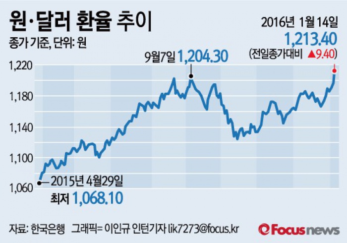 (서울=포커스뉴스) 14일 서울 외환시장에서 원-달러 환율은 전일 종가보다 9.40원 오른 1,213.40원에 장을 마감했다.