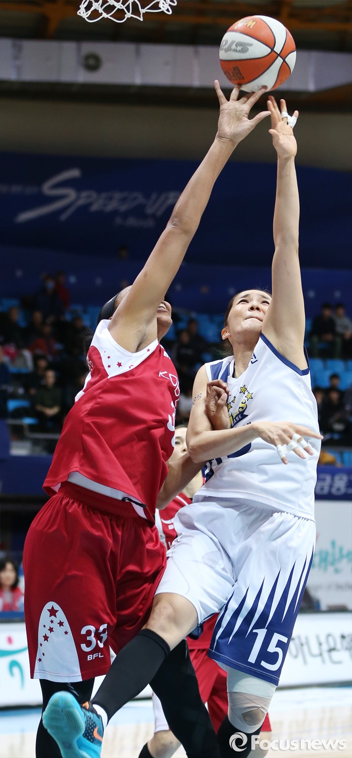 (인천=포커스뉴스) 14일 인천도원체육관에서 열린 2015~2016 여자프로농구 신한은행-KDB생명 경기에서 신한은행 신정자와 KDB생명 플레넷이 치열한 리바운드볼 다툼을 하고 있다.