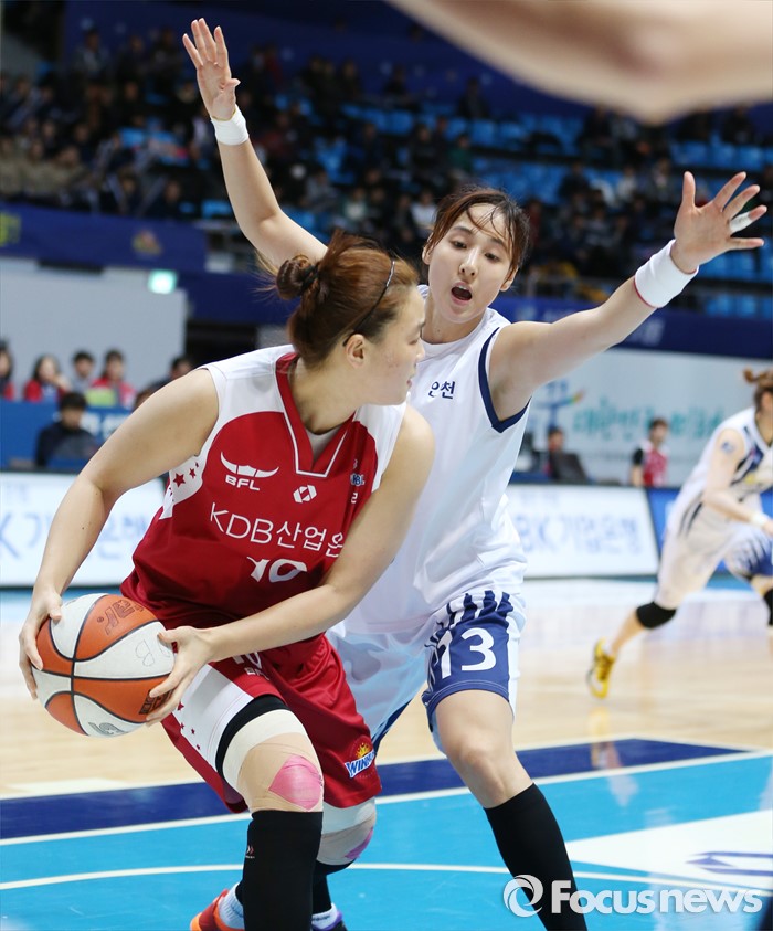 (인천=포커스뉴스) 14일 인천도원체육관에서 열린 2015~2016 여자프로농구 신한은행-KDB생명 경기에서 신한은행 김단비가 KDB생명 최원선을 마크하고 있다.