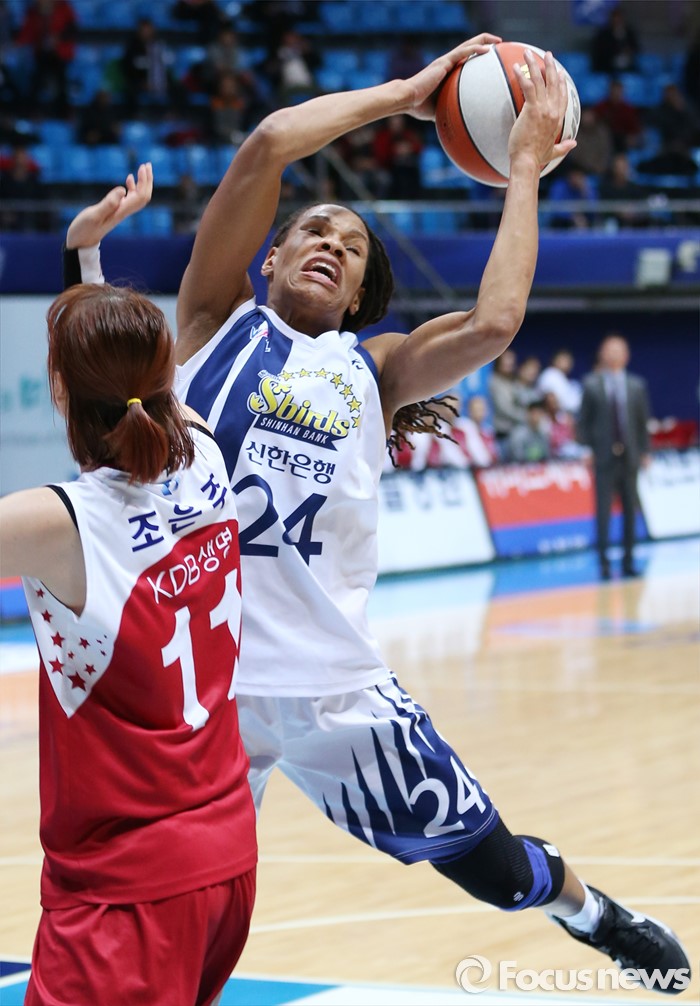 (인천=포커스뉴스) 14일 인천도원체육관에서 열린 2015~2016 여자프로농구 신한은행-KDB생명 경기에서 신한은행 모니크 커리가 KDB생명 조은주를 제치고 리바운드볼을 잡고 있다.