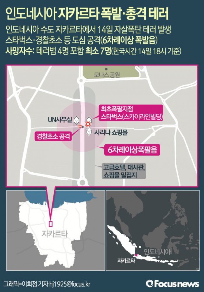 한편 이날 오전 인도네시아 수도 자카르타 도심 스타벅스 앞에서 수차례의 폭발과 총격이 발생해 최소 7명이 숨졌다. 이에 대해 인도네시아 경찰국은 이슬람국가(IS)의 소행으로 보인다는 입장을 밝혔고 IS 또한 자신들의 소행이라고 주장했다.(자카르타/인도네시아=게티/포커스뉴스) 인도네시아 경찰이 14일(현지시간) 인도네시아의 수도 자카르타 도심 연쇄 테러 이후 폭발이 일어난 장소 주변을 감시하고 있다. 이날 오전부터 쇼핑몰, 고급 호텔, 대사관 등이 밀집한 자카르타 도심에선 폭발이 6차례 이어지고 총격전이 잇따르는 테러가 발생했다. 2016.01.14 ⓒ게티이미지/멀티비츠 (서울=포커스뉴스) 인도네시아 수도 자카르타 도심에서 14일 오전(현지시간) 자살폭탄 테러 공격으로 추정되는 수 차례 폭발과 총격이 발생했다고 AP·AFP통신 등이 보도했다. 2016.01.14 이희정 기자