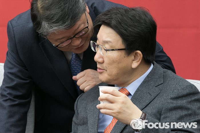 (서울=포커스뉴스) 조원진(왼쪽) 새누리당 원내수석부대표와 권성동 전략기획본부장이 15일 오전 서울 여의도 국회에서 열린 주요당직자회의에 참석해 대화하고 있다.