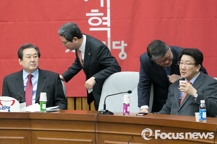 (서울=포커스뉴스) 김무성(왼쪽) 새누리당 대표와 김학용 비서실장(왼쪽 두번째), 조원진(오른쪽 두번째) 원내수석부대표와 권성동 전략기획본부장이 15일 오전 서울 여의도 국회에서 열린 주요당직자회의에 참석해, 각각 대화하고 있다.