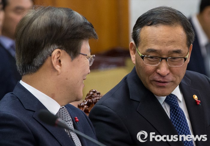(서울=포커스뉴스) 15일 오전 서울 종로구 정부서울청사에서 열린 국가정책조정회의에 참석한 홍윤식 행정자치부 장관이 최양희 미래부 장관과 대화하고 있다.