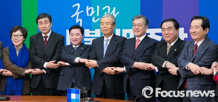 (서울=포커스뉴스) 더불어민주당 조기선대위원장으로 영입된 김종인 전 새누리당 국민행복추진위원장이 15일 오전 서울 여의도 국회에서 기자간담회에 앞서 의원들과 함께 포즈를 취하고 있다. 왼쪽부터 이미경 의원, 이종걸 원내대표, 이석현 국회 부의장, 김 위원장, 문재인 대표, 문희상, 정세균 의원.