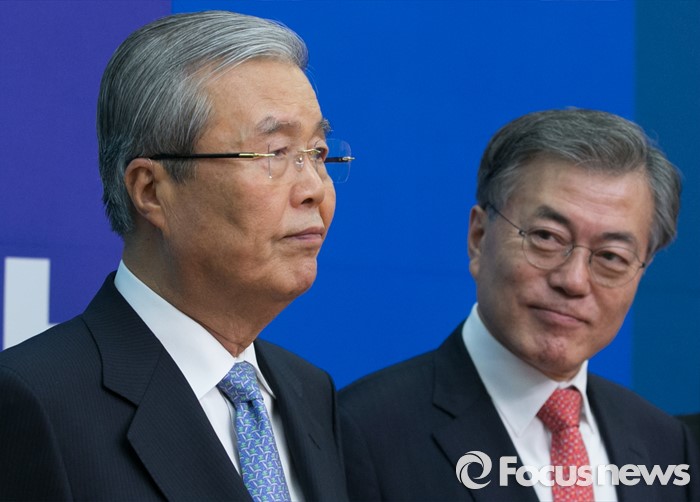 (서울=포커스뉴스) 더불어민주당 조기선대위원장으로 영입된 김종인(왼쪽) 전 새누리당 국민행복추진위원장이 15일 오전 서울 여의도 국회에서 기자간담회에 앞서 문재인 대표와 함께 취재진을 향해 포즈를 취하고 있다.