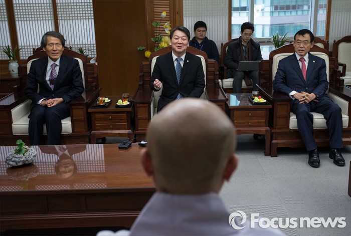 (서울=포커스뉴스) '국민의당' 안철수(왼쪽 두번째) 의원과 한상진 창당준비위원장이 15일 오전 서울 종로구 조계사에서 자승 총무원장을 비롯한 스님들과 새해 인사를 나누고 있다.