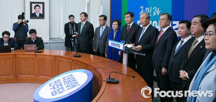 (서울=포커스뉴스) 더불어민주당 조기선대위원장으로 영입된 김종인 전 새누리당 국민행복추진위원장이 15일 오전 서울 여의도 국회에서 기자간담회를 하고 있다. 오른쪽부터 유승희 최고위원, 문희상 의원, 이석현 국회 부의장, 문재인 대표, 김 위원장, 이종걸 원내대표, 이미경, 원혜영, 신기남 의원.