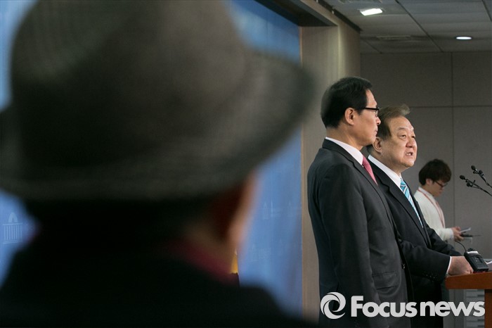 (서울=포커스뉴스) 정대철(왼쪽 세번째) 더불어민주당 상임고문이 15일 오전 서울 여의도 국회 정론관에서 탈당 표명 기자회견을 하고 있다.