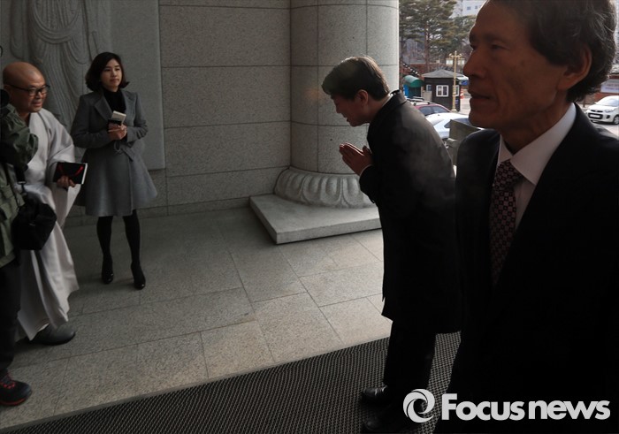 무소속 안철수 의원(오른쪽 둘째)이 15일 오전 서울 종로구 견지동 조계사 한국불교역사문화기념관에 도착해 조계종 총무원 사서실장 심경스님을 향해 합장해 인사하고 있다.