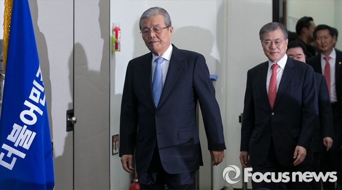 (서울=포커스뉴스) 더불어민주당 조기선대위원장으로 영입된 김종인(왼쪽) 전 새누리당 국민행복추진위원장이 15일 오전 서울 여의도 국회에서 기자간담회에 앞서 문재인 대표와 함께 입장하고 있다.