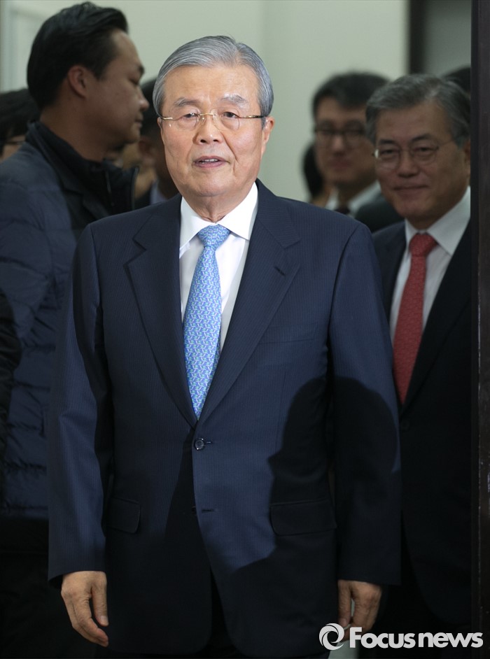 (서울=포커스뉴스) 더불어민주당 조기선대위원장으로 영입된 김종인(왼쪽) 전 새누리당 국민행복추진위원장이 15일 오전 서울 여의도 국회에서 기자간담회에 앞서 문재인 대표와 함께 입장하고 있다.