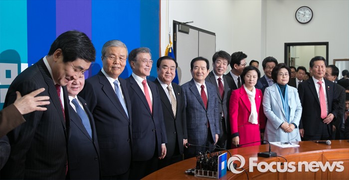 (서울=포커스뉴스) 더불어민주당 조기선대위원장으로 영입된 김종인 전 새누리당 국민행복추진위원장이 15일 오전 서울 여의도 국회에서 기자간담회에 앞서 의원들과 함께 취재진을 향해 포즈를 취하고 있다. 왼쪽부터 이종걸 원내대표, 이석현 국회 부의장, 김 위원장, 문재인 대표, 문희상, 정세균, 신계륜 의원, 추미애, 유승희, 정청래 최고위원.